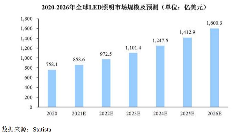 根据Statista数据显示,2020年度全球LED照明市场规模达到758.1亿美元,产业广泛分布在北美、欧洲、亚洲地区,预计2026年全球市场规模将达到1,600.3亿美元,长期来看呈明显上升趋势。