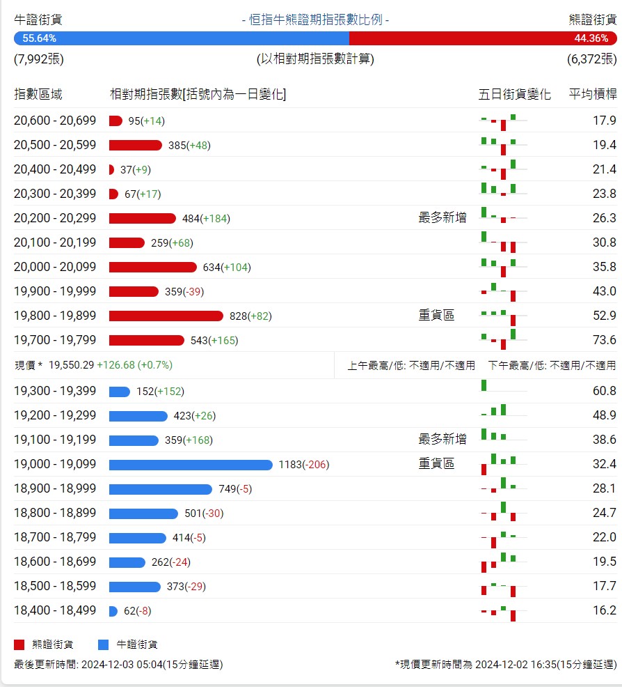 查投资获悉,截至12月3日,恒指最新的牛熊街货比例为56:44。