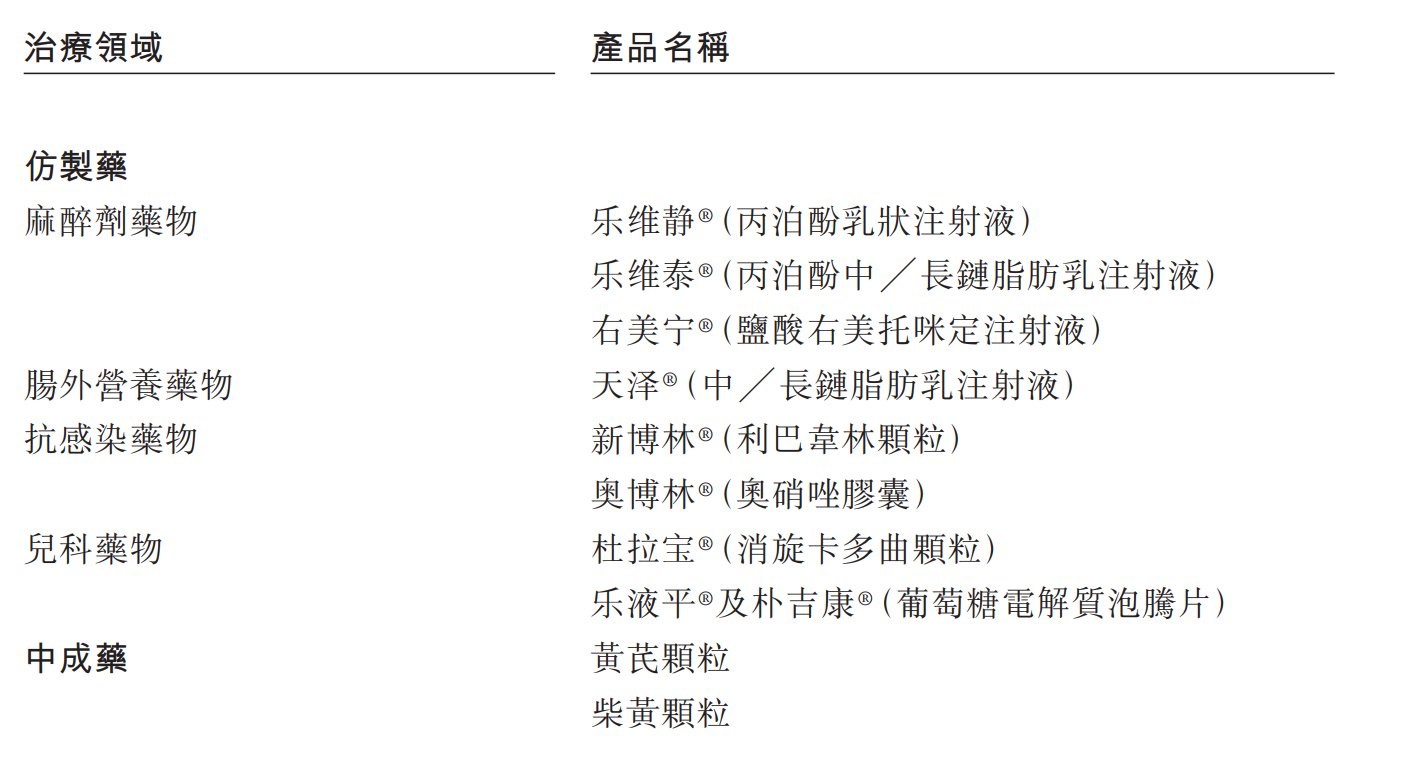 百利天恒的仿制药及中成药业务的产品组合覆盖麻醉、肠外营养、抗感染、儿科等治疗领域。于往绩记录期,公司的收入来自于销售超过100种规格的29种获批药品,其中包括25种仿制药产品及四种中成药产品。该等产品收入在为公司的创新药物开发提供资金方面发挥着至关重要的作用。