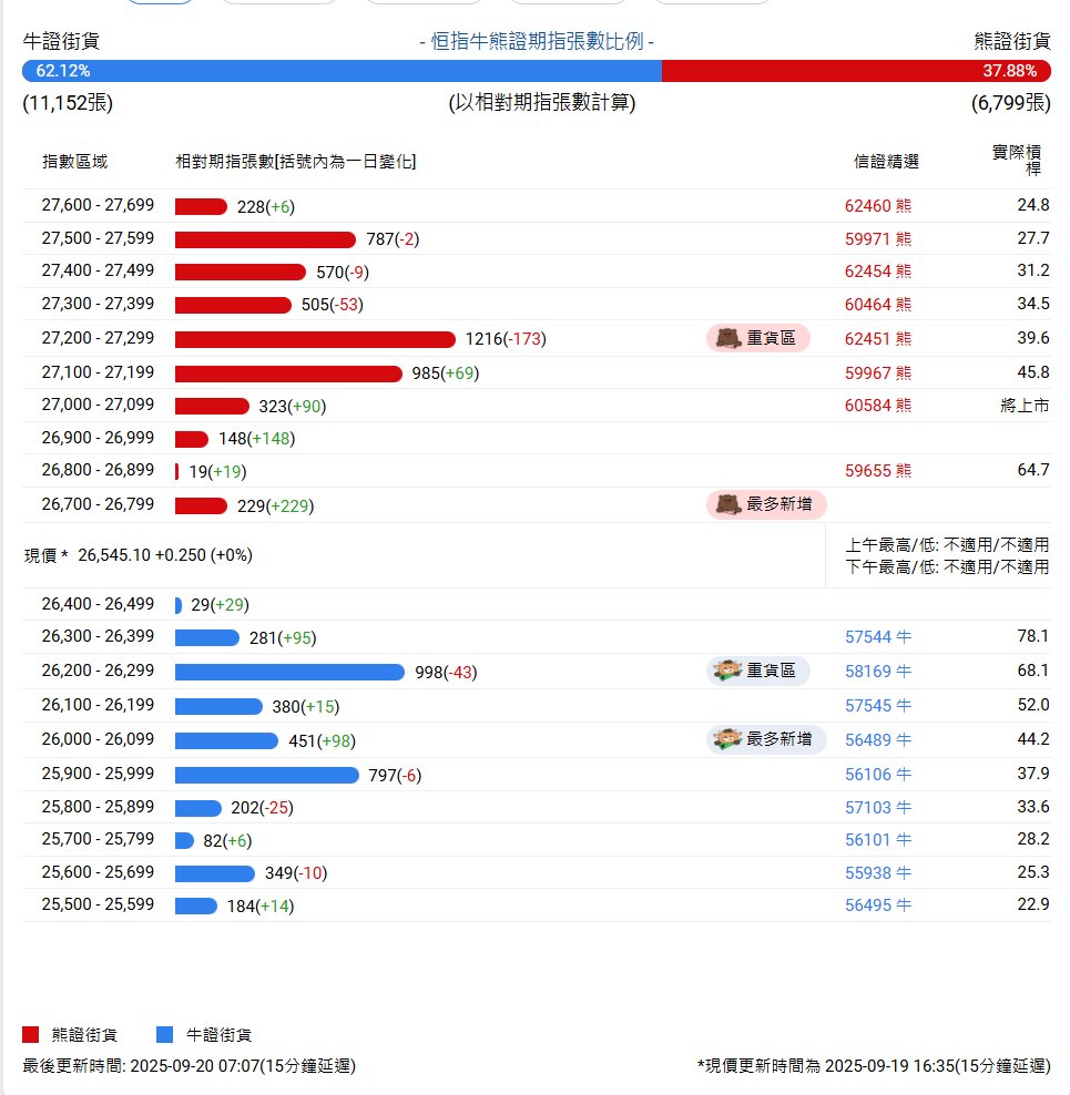 查投资获悉,截至9月20日,恒指最新的牛熊街货比例为62:38。