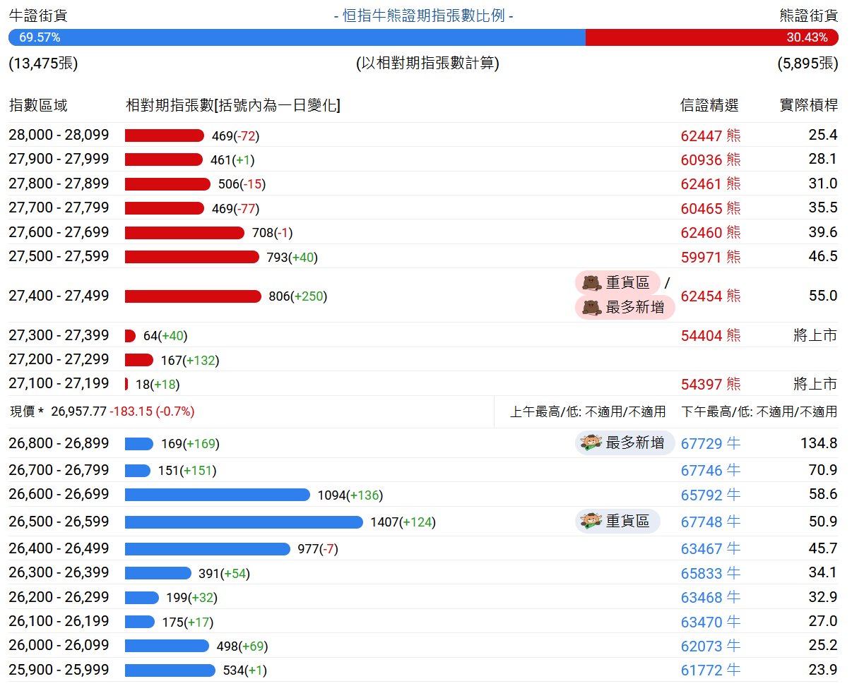 中信证券牛熊证街货分布图中的数据显示,熊证街货重货区和最多新增都在27400-27499区间,该区间最新熊证数量为806张,较上一交易日增加250张。
