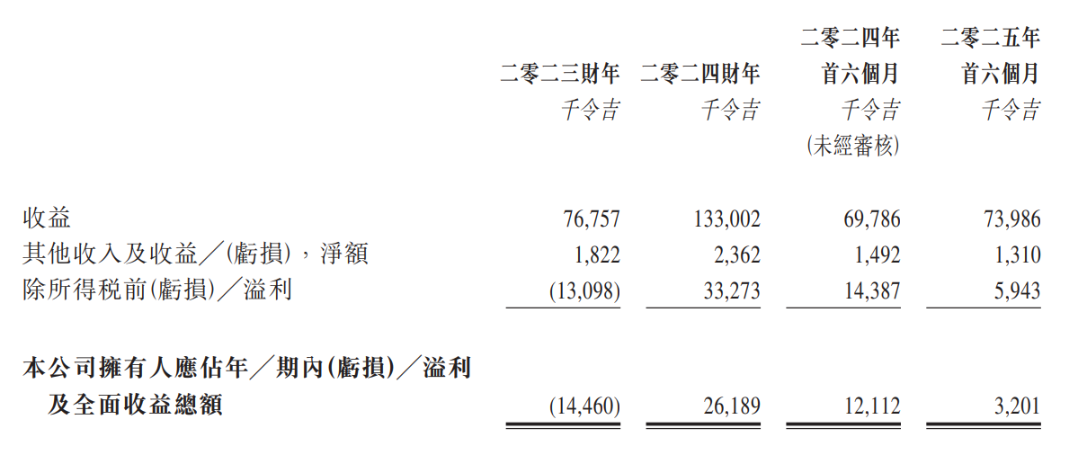 财务方面,2023财年、2024财年、2025财年首六个月,该公司实现收益分别约为7675.7万令吉、1.33亿令吉、7398.6万令吉;同期该公司拥有人应占年内溢利及全面收益总额分别为-1446万令吉、2618.9万令吉、320.1万令吉。