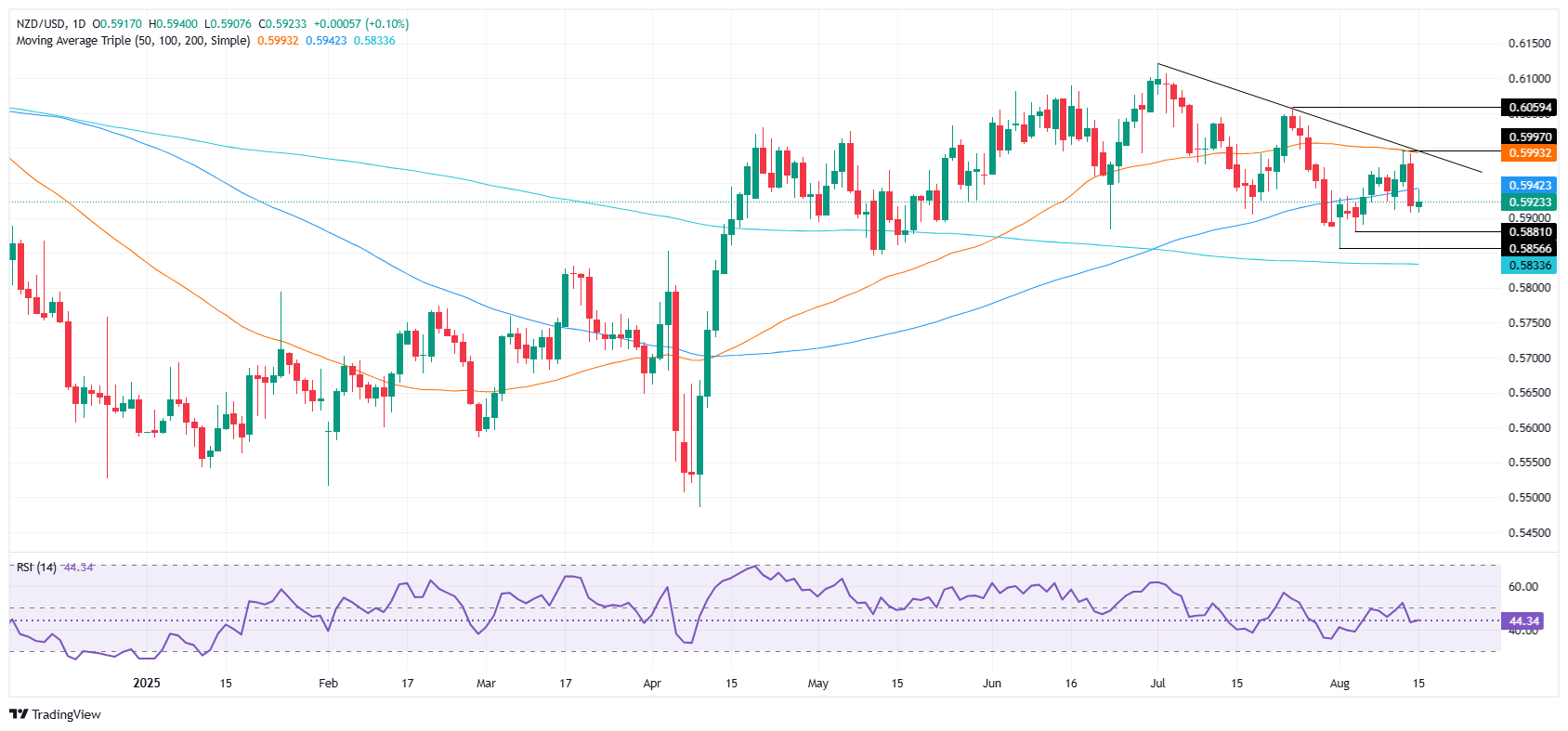 The New Zealand Dollar (NZD) halted its rally and turned negative, poised to finish 0.49% down in the week, after failing to clear key resistance levels, which paved the way for a drop towards the weekly lows near 0.5900. NZD/USD trades at 0.5923, down 0.09%.