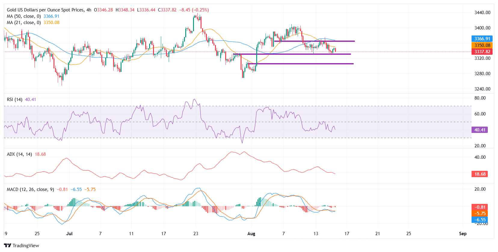 Gold (XAU/USD) remains under pressure on the 4-hour chart, hovering near the $3,340 mark and struggling to break above the 21-period SMA at $3,350.
