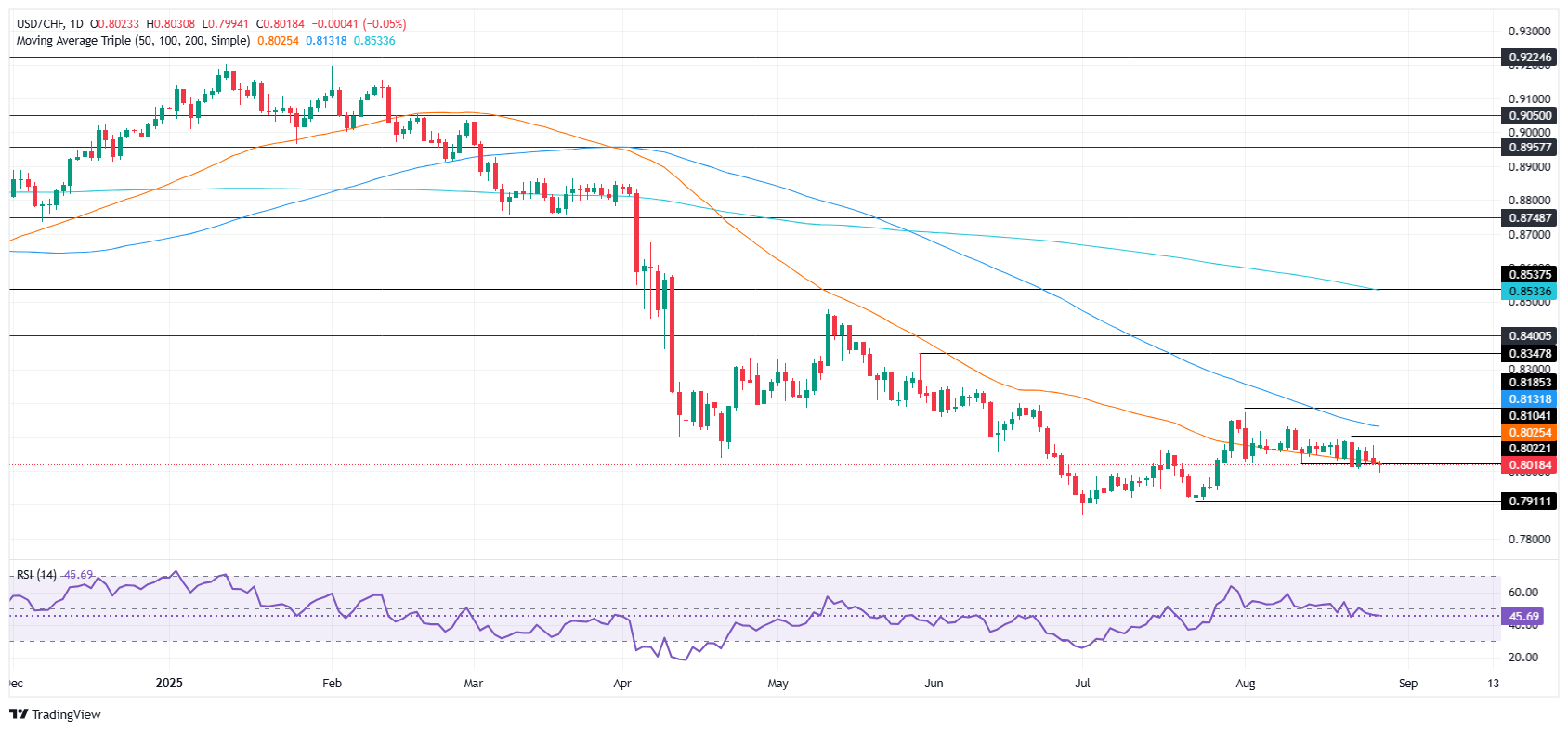 The USD/CHF consolidates near the 0.8000 figure, after reaching a three-day low of 0.7994 during the session. From a price action standpoint, the pair has reached a series of lower highs and lower lows. Another daily close below the 50-day Simple Moving Average (SMA) at 0.8025 could pave the way for testing yearly lows.