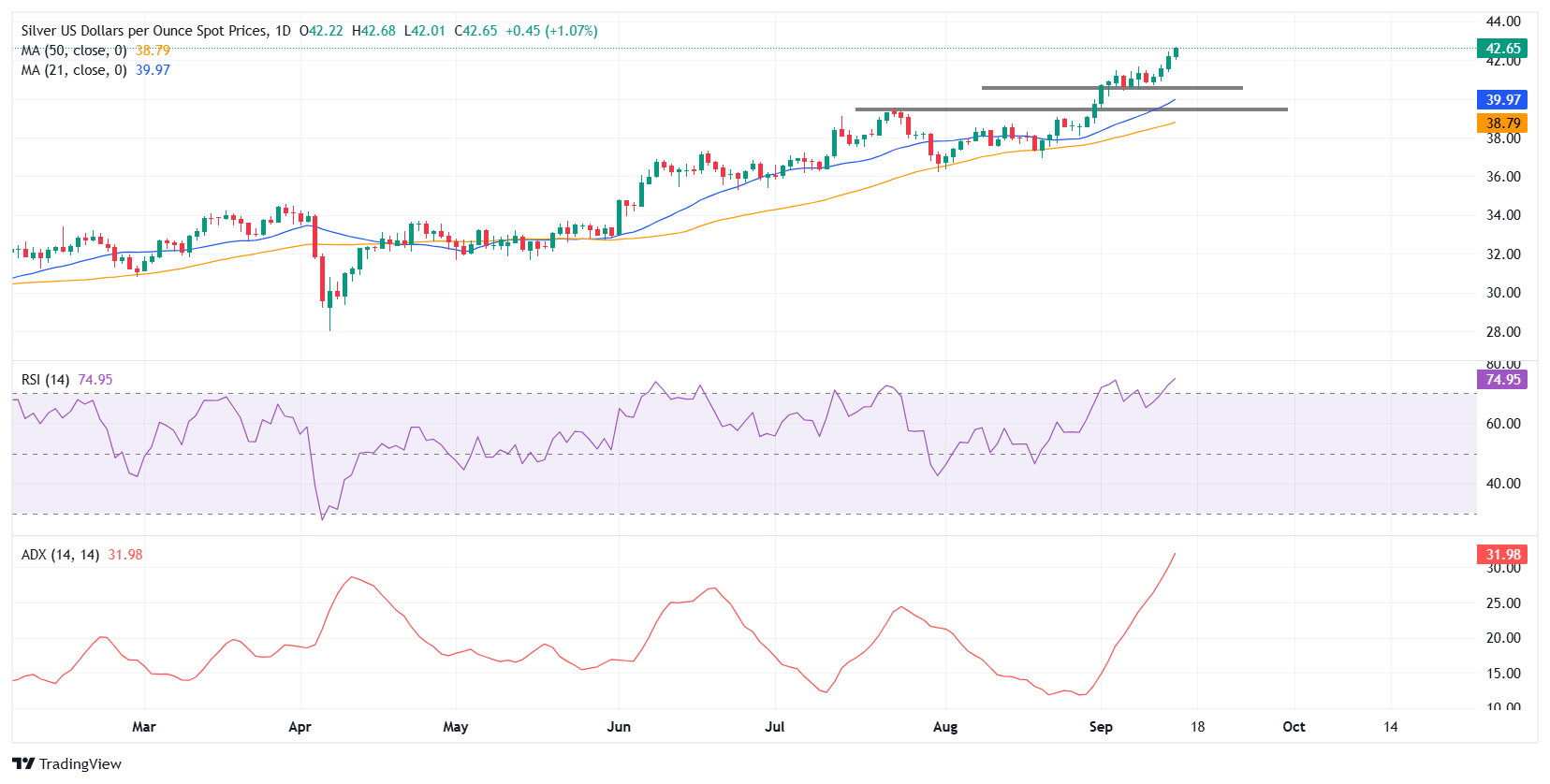 Silver (XAG/USD) continues its rally on Monday, building on last week’s strong momentum to notch a fourth consecutive daily gain. The white metal is supported by a broadly weak US Dollar (USD) and retreating US Treasury yields as traders brace for a pivotal Federal Reserve (Fed) interest rate decision on Wednesday, where a 25-basis-point (bps) rate cut is fully priced in, but the real focus lies on how dovish the forward outlook will be.