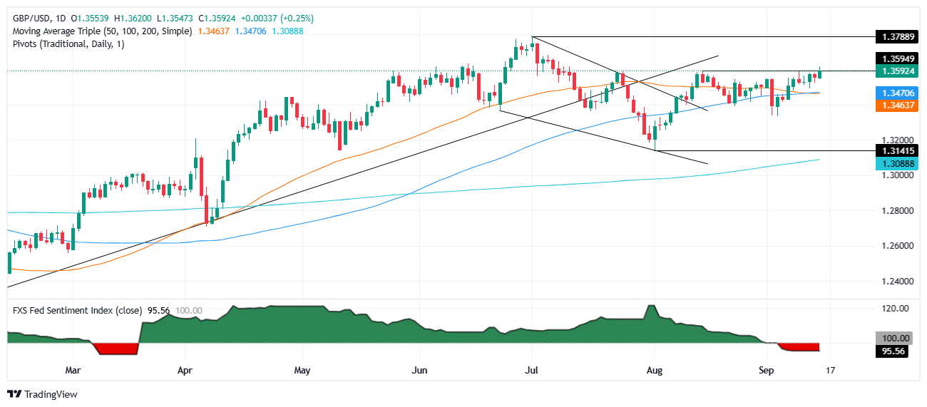 - GBP/USD rebounds from 1.3548 low to 1.3600 as Fed cut odds stand at 94% for a 25 bps move.