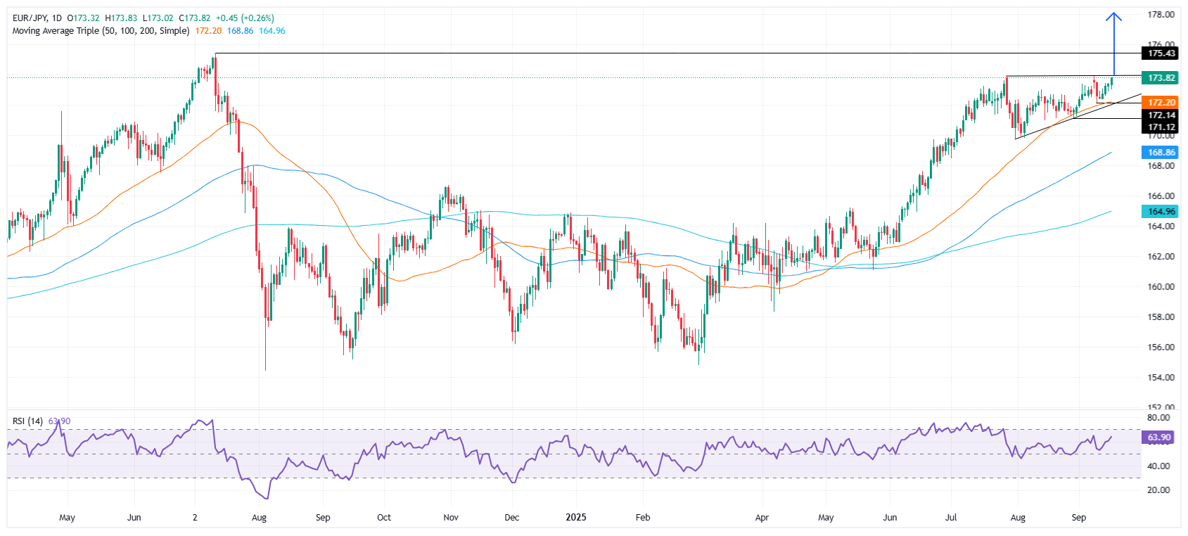- EUR/JPY extends rally for second day, trading at 173.80 with bullish technical setup reinforcing upside potential.