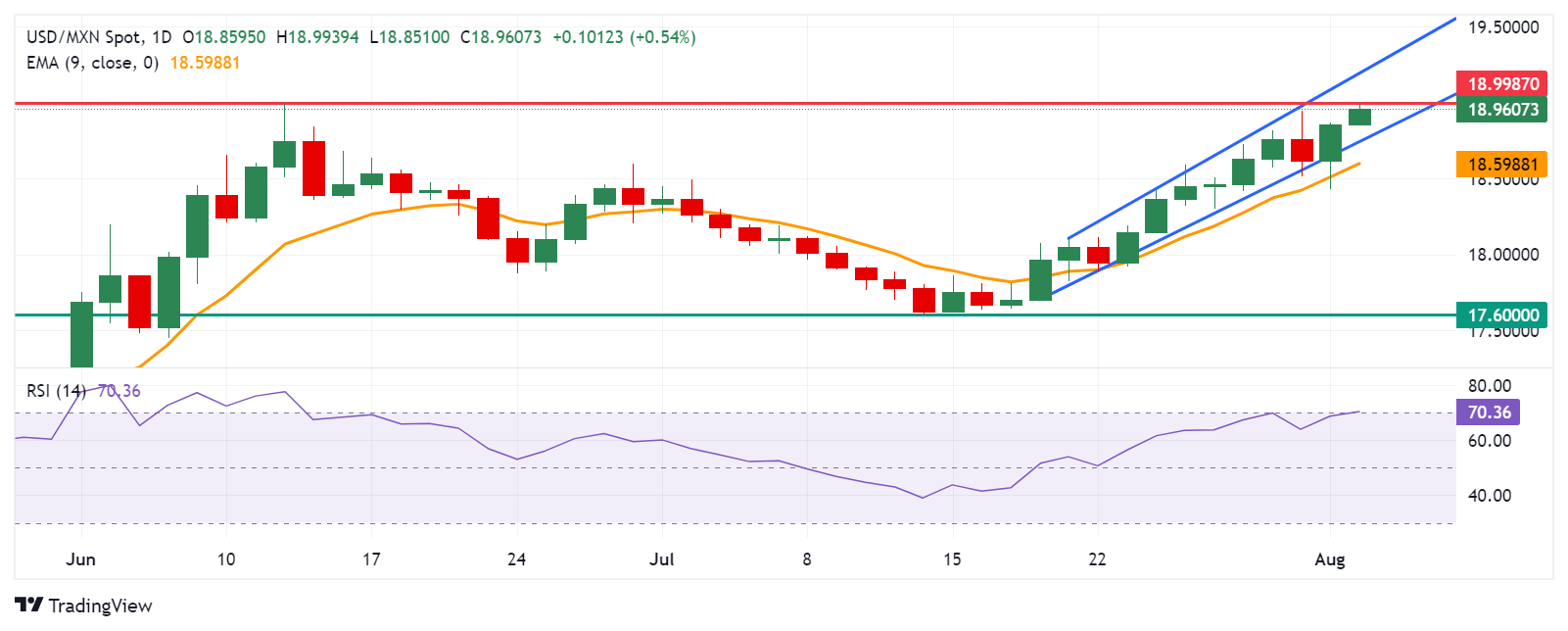 USD/MXN melanjutkan kenaikannya untuk sesi kedua, diperdagangkan di sekitar 18,90 selama jam-jam Eropa pada hari Jumat. Analisis grafik harian mengindikasikan bias bullish karena pasangan mata uang ini bergerak lebih tinggi dalam saluran menanjak.