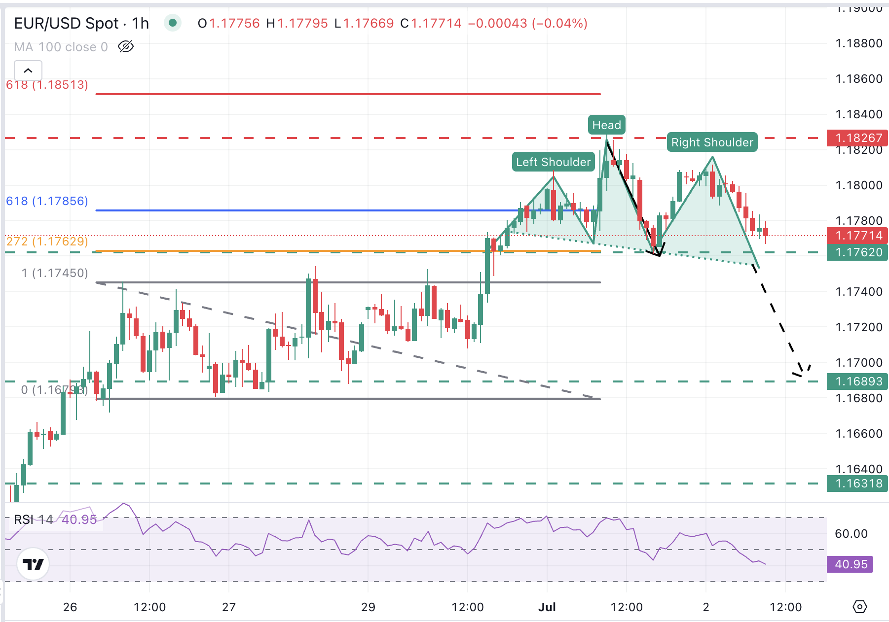 Sebuah tinjauan pada grafik 1-jam menunjukkan momentum bearish yang meningkat, dengan Relative Strength Index (RSI) periode 14 bergerak lebih rendah ke wilayah negatif saat aksi harga menembus neckline pola Head & Shoulders (H&S).