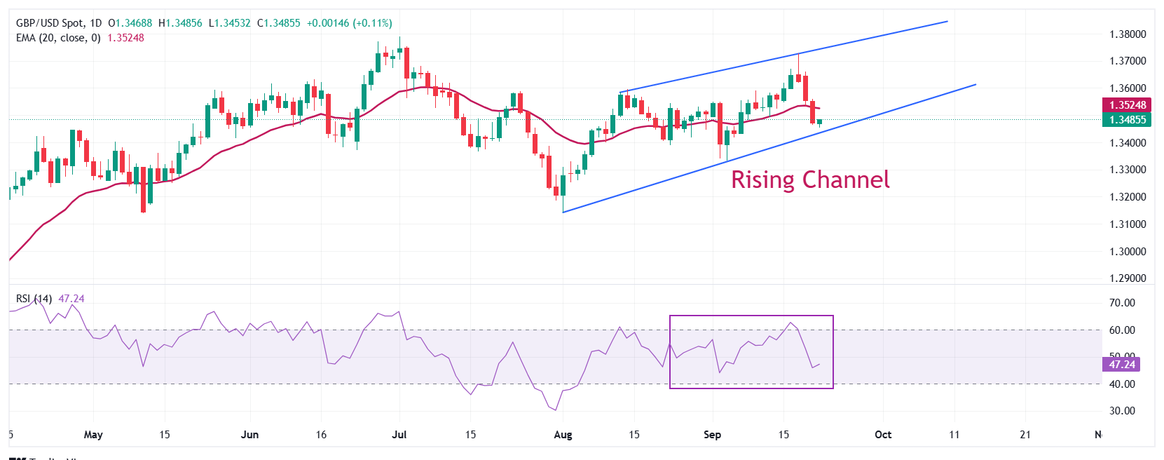 Pound Sterling pulih mendekati 1,3500 terhadap Dolar AS pada hari Senin. Namun, tren jangka pendek Pasangan mata uang GBP/USD tetap bearish karena diperdagangkan di bawah Exponential Moving Average (EMA) 20-hari, yang berada di sekitar 1,3524. Cable diperdagangkan di dekat ujung bawah formasi Rising Channel di sekitar 1,3470.