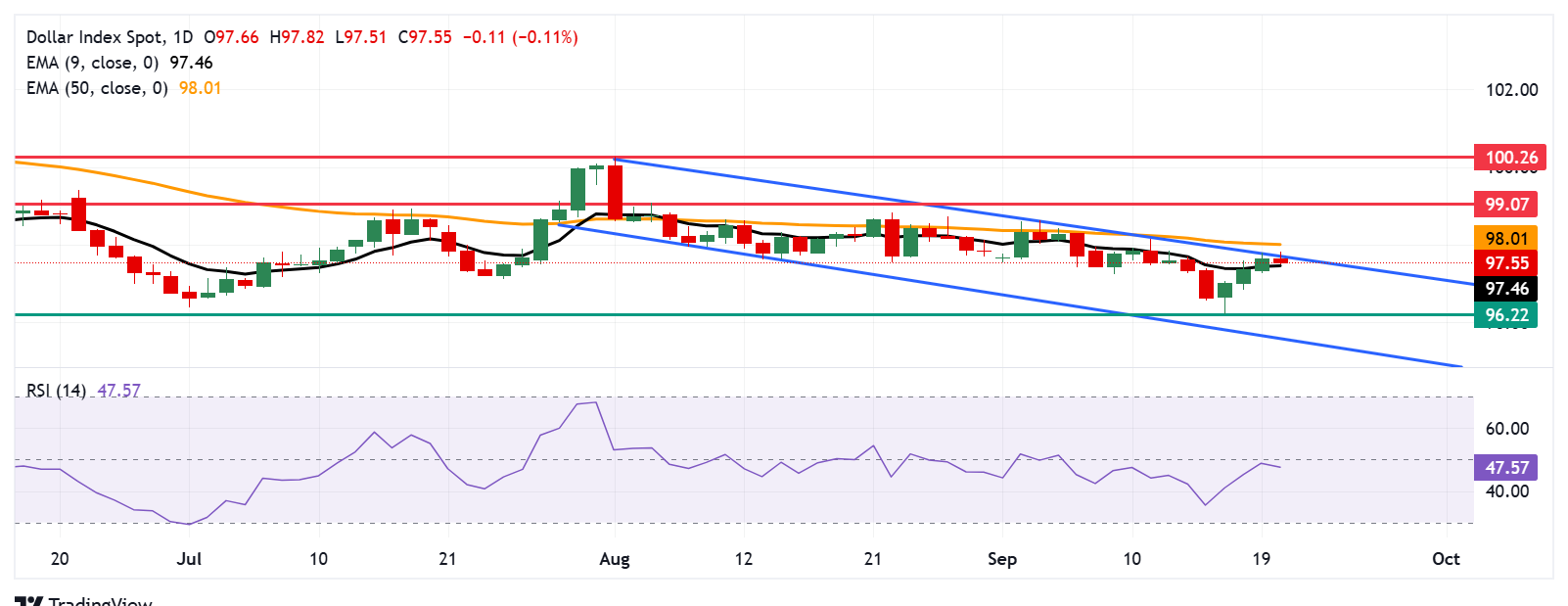 Indeks Dolar AS (DXY), yang mengukur nilai Dolar AS (USD) terhadap enam mata uang utama, menghentikan kenaikan tiga hari beruntunnya dan diperdagangkan di sekitar 97,50 selama perdagangan sesi Eropa pada hari Senin. Analisis teknis pada grafik harian menunjukkan indeks dolar menguji untuk menembus batas atas pola descending channel, mengindikasikan potensi pergeseran bullish.