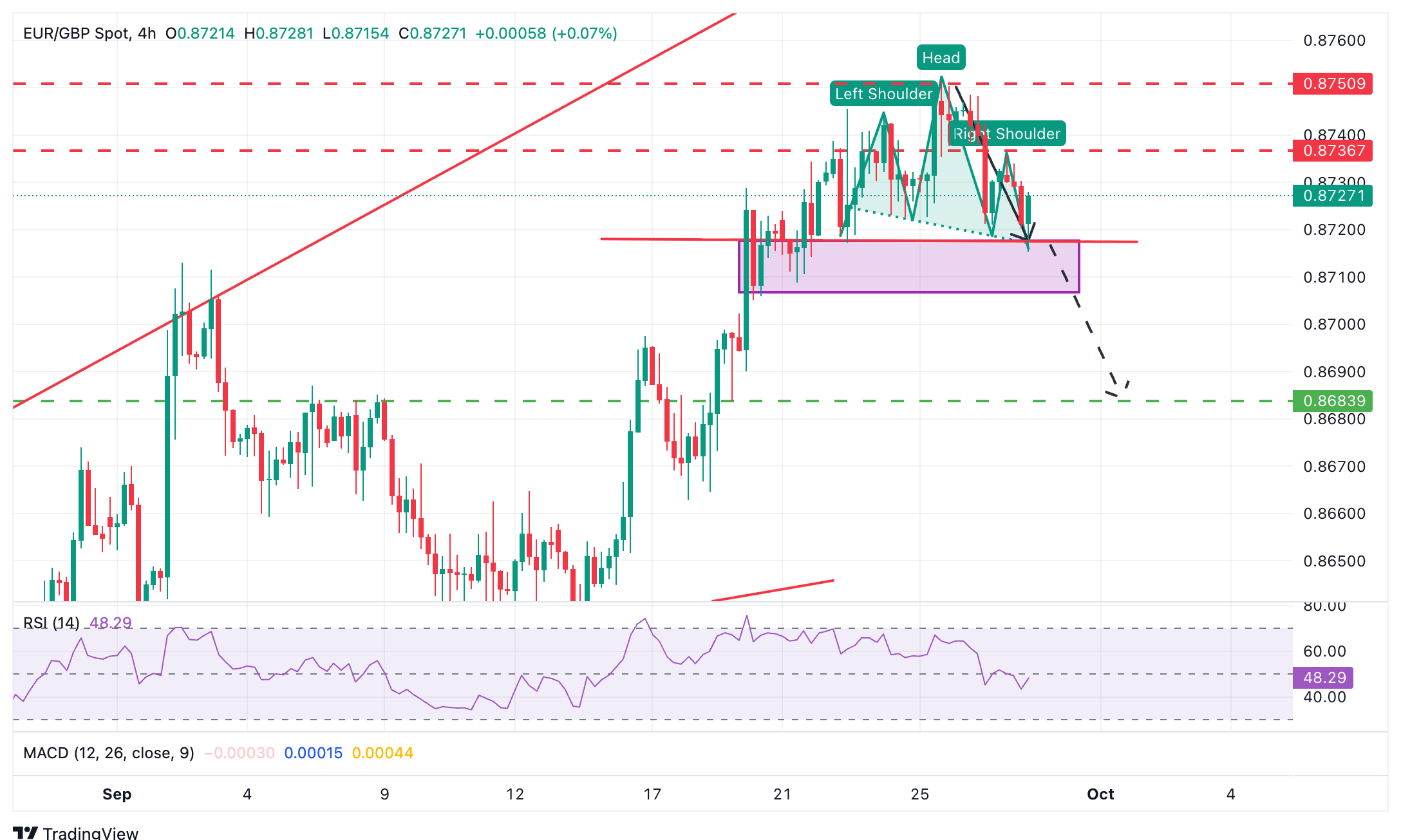 - EUR/GBP melayang di dekat neckline pola H&S bearish yang potensial, di 0,8720.