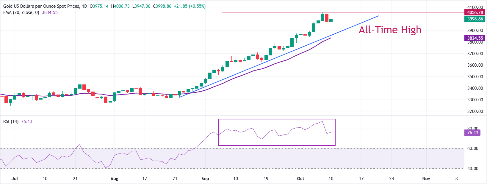 Harga Emas (XAU/USD) diperdagangkan 0,4% lebih tinggi mendekati $3.995,00 selama perdagangan sesi Eropa pada hari Jumat. Logam kuning ini stabil setelah mengalami pergerakan korektif pada hari Kamis, yang menyusul level tertinggi baru sepanjang masa dekat $4.060 yang dicatat pada hari Rabu.