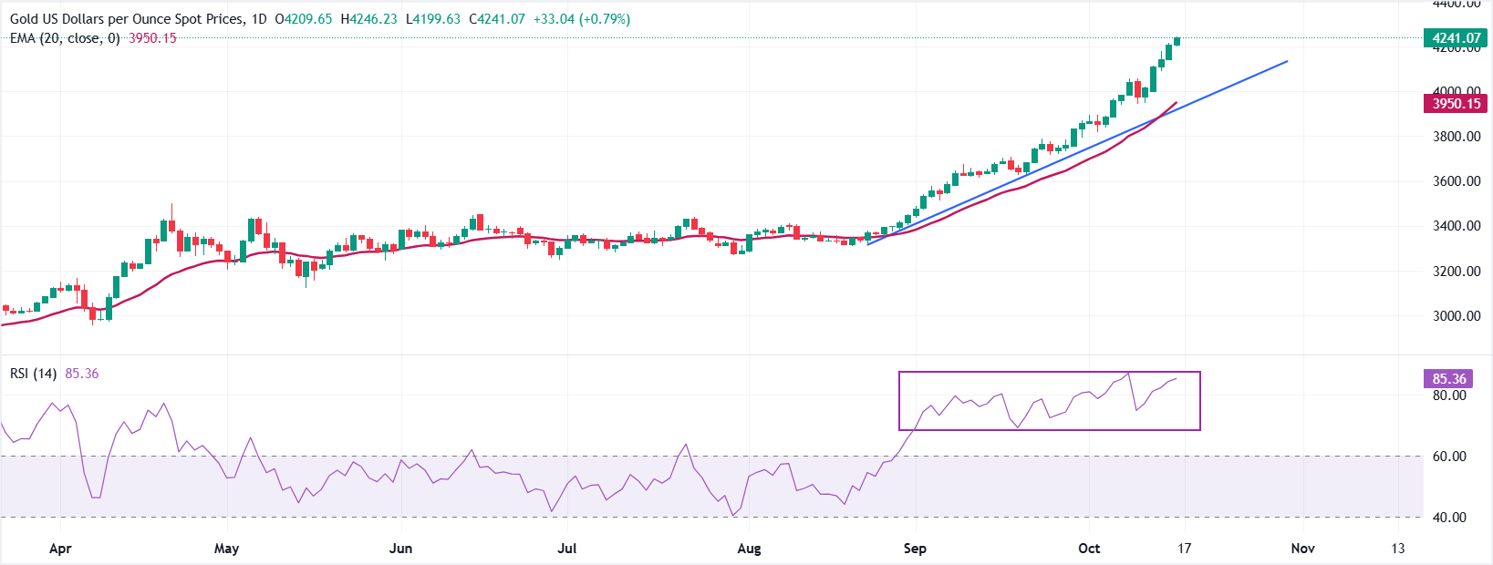 Harga Emas mencatat tertinggi baru sepanjang masa di dekat $4.246 pada hari Kamis. Tren keseluruhan harga Emas tetap bullish karena Exponential Moving Average (EMA) 20-hari miring ke atas di sekitar $3.950,15. Garis tren yang miring ke atas dari terendah 22 Agustus di sekitar $3.321,50 akan berfungsi sebagai support utama bagi harga Emas.