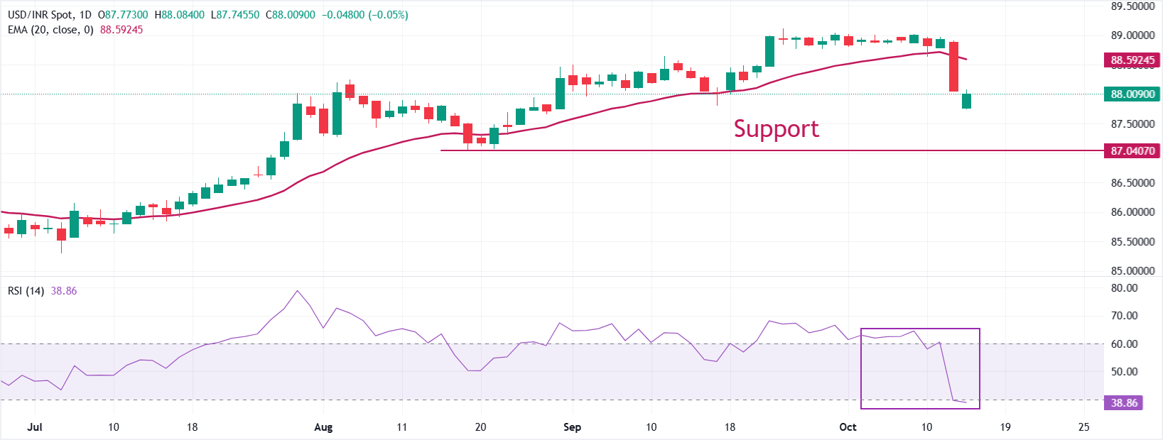 Rupee India menarik penawaran beli setelah merosot ke dekat 87,80 terhadap Dolar AS pada hari Kamis. Pasangan mata uang USD/INR menghadapi tekanan jual yang tajam pada hari Rabu setelah penembusan konsolidasi tiga minggu yang terbentuk dalam kisaran antara 88,75 dan 89,10.