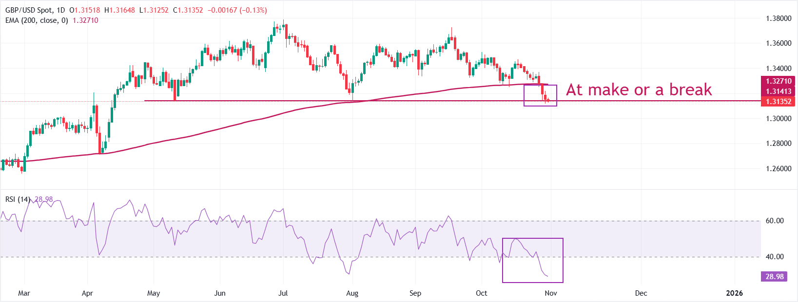 Pound Sterling diperdagangkan dengan rentan terhadap Dolar AS di dekat terendah baru enam bulan di sekitar 1,3115 yang dicatat pada hari Kamis. Prospek pasangan mata uang ini tetap bearish karena diperdagangkan di bawah Exponential Moving Average (EMA) 200-hari, yang berada di sekitar 1,3270.