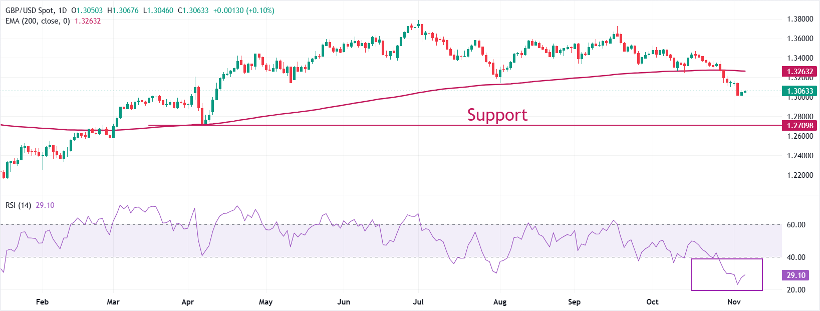 Pound Sterling menguat mendekati 1,3085 terhadap Dolar AS pada hari Kamis. Pasangan mata uang GBP/USD mempertahankan level terendah lebih dari enam bulan di sekitar 1,3000 yang dicatat pada hari Selasa. Tren keseluruhan pasangan mata uang ini tetap bearish karena diperdagangkan di bawah Exponential Moving Average (EMA) 200-hari, yang berada di sekitar 1,3263.