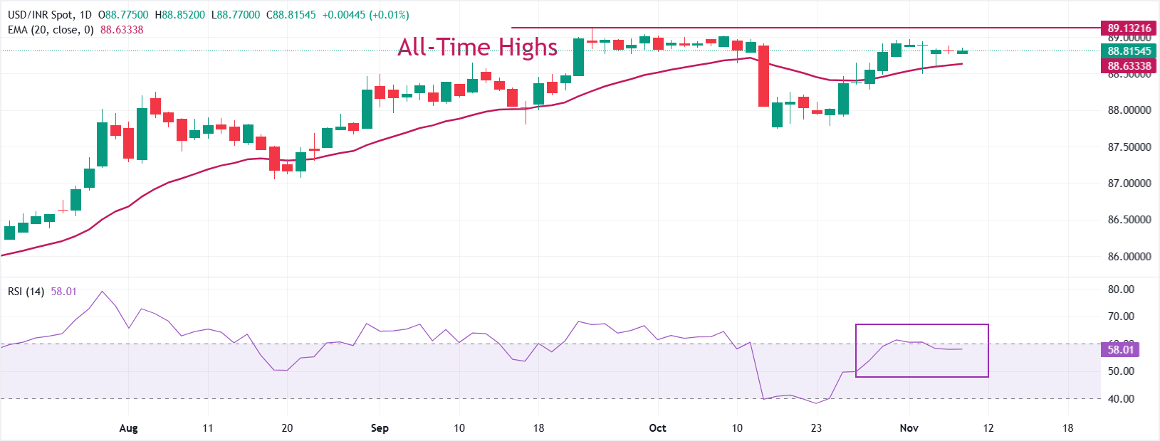 USD/INR goyah di dekat 88,80 pada hari Senin. Pasangan mata uang ini tetap di atas Exponential Moving Average (EMA) 20-hari, yang diperdagangkan di sekitar 88,63.