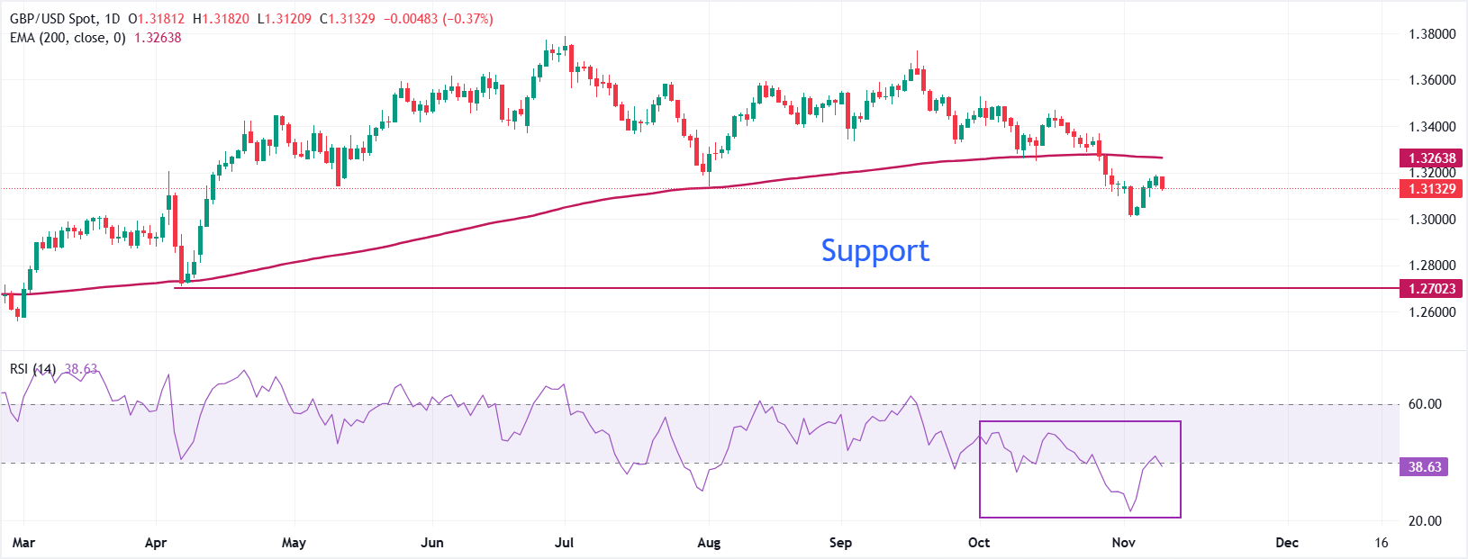 Pound Sterling turun ke dekat 1,3130 terhadap Dolar AS pada hari Selasa. Tren keseluruhan pasangan mata uang ini tetap bearish karena diperdagangkan di bawah Exponential Moving Average (EMA) 200-hari, yang berada di sekitar 1,3264.
