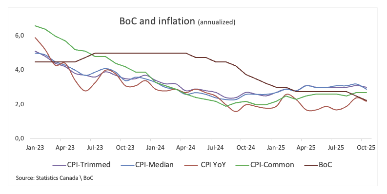 Bagi pasar, data IHK umum hari Senin akan menjadi hal pertama yang mereka perhatikan. Namun, di dalam BoC, sorotan akan tertuju pada perincian, terutama pengukur Trimmed, Median, dan Common inti. Dua yang pertama tetap terjebak di atas 3%, level yang terus mengkhawatirkan para pengambil kebijakan, sementara pengukur Common juga telah meningkat, masih jauh di atas target bank.