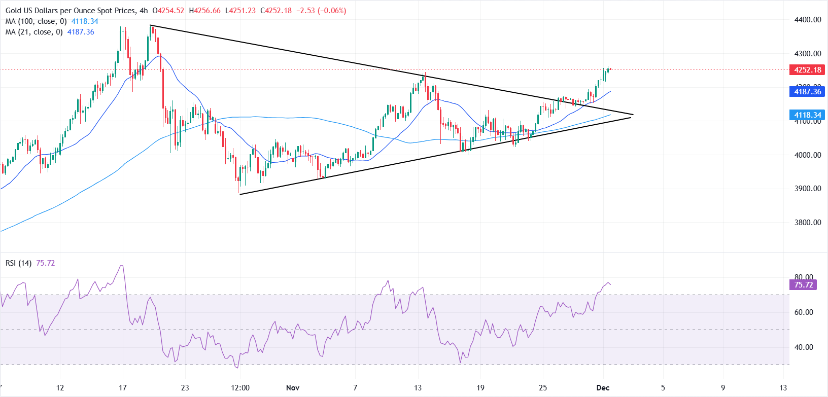 Pada saat berita ini ditulis, XAU/USD diperdagangkan di sekitar $4.260, menempatkan logam ini pada jalur untuk mencatatkan kinerja tahunan terbaiknya sejak 1979. Harga naik hampir 60% sejauh tahun ini, didukung oleh permintaan bank sentral yang kuat, aliran ETF yang robust, ketegangan geopolitik yang persisten, dan prospek penurunan suku bunga di Amerika Serikat (AS).
