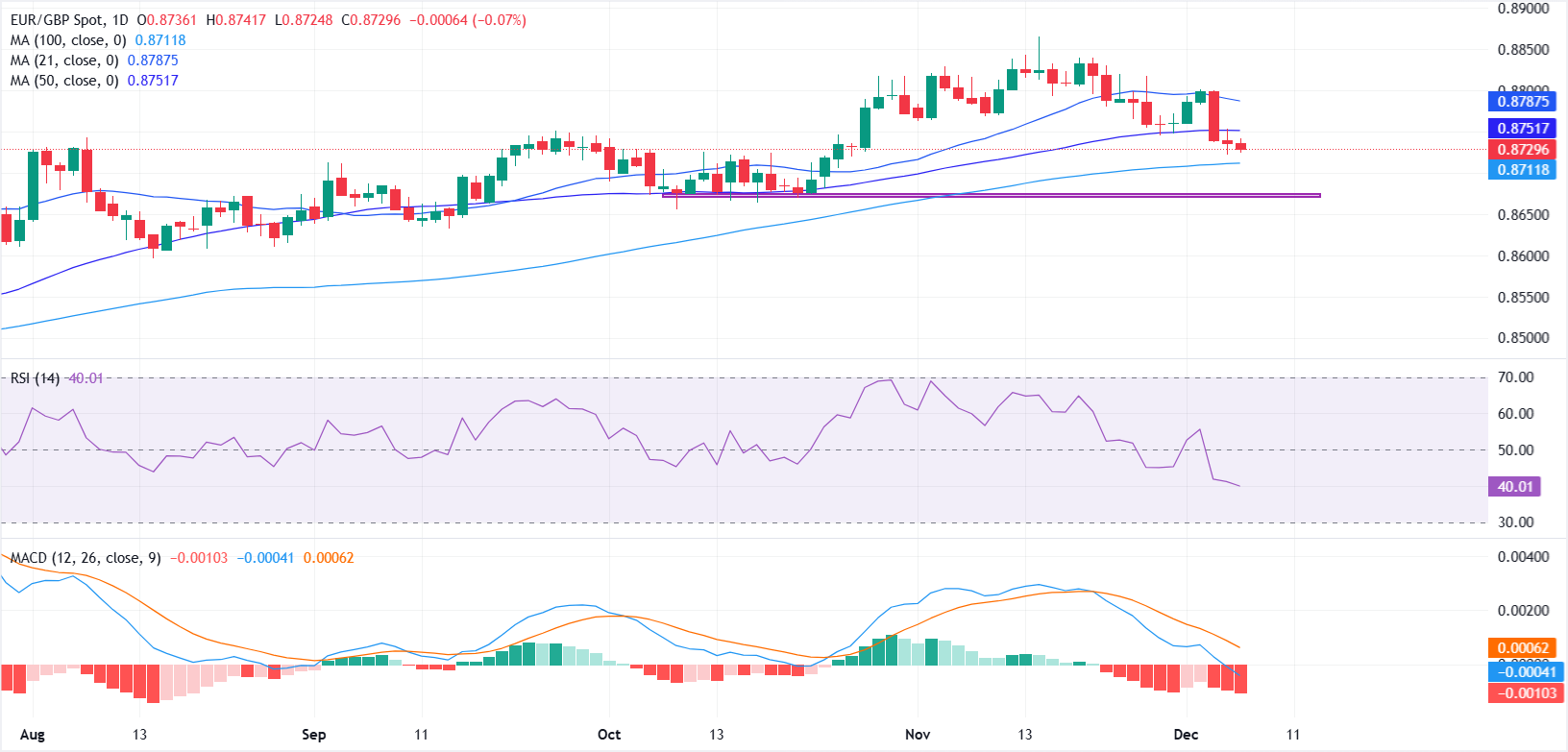 Dari perspektif teknis, EUR/GBP telah berada di bawah tekanan penurunan yang stabil sejak mencapai puncaknya di dekat 0,8865 pada pertengahan November, level yang menandai tertinggi tahun ini dan pembacaan terkuat sejak April 2023. Pasangan mata uang ini sejak itu jatuh di bawah SMA 21-hari dan 50-hari, menunjukkan pergeseran menuju struktur jangka pendek yang lebih lembut saat penjual terus mendominasi.