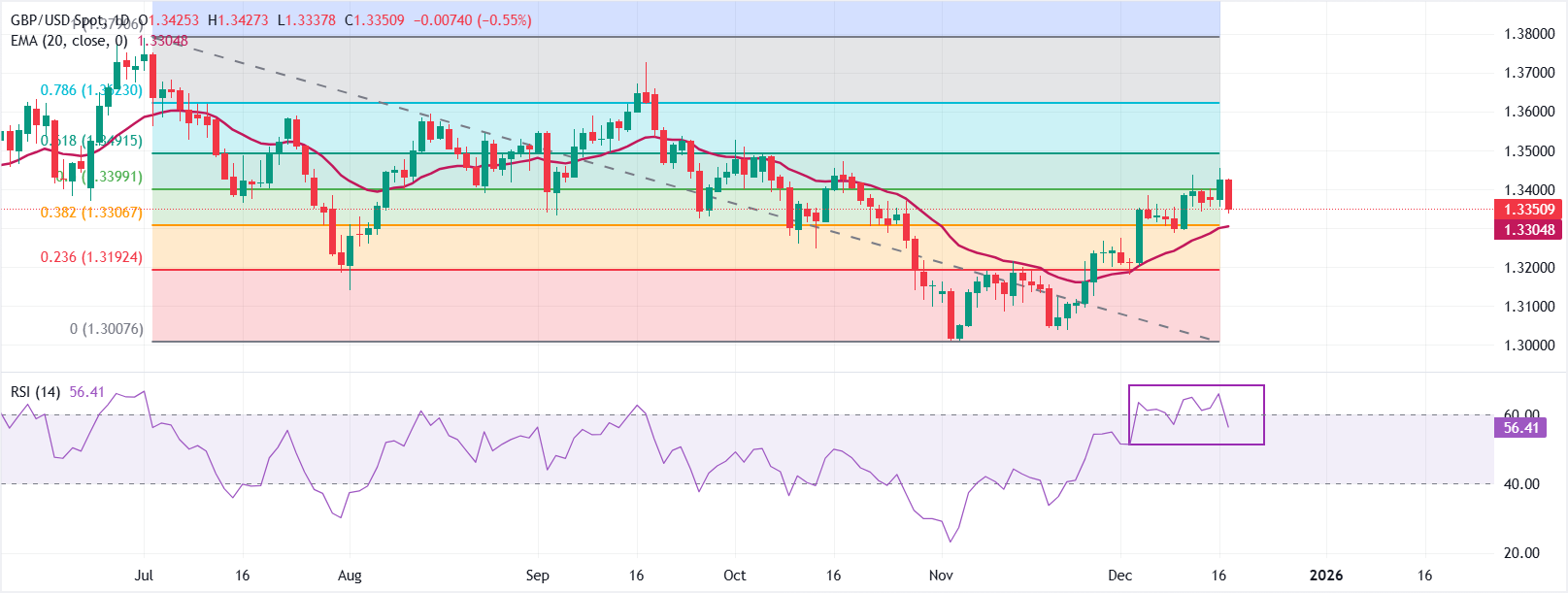 GBP/USD merosot ke dekat 1,3340 pada hari Rabu. Namun, bias jangka pendek pasangan mata uang ini tetap naik karena harga bertahan di atas Exponential Moving Average (EMA) 20-hari yang miring ke atas di 1,3305.