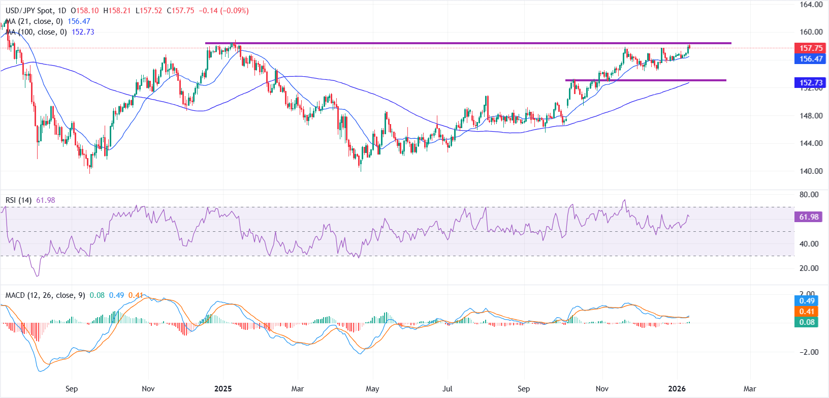 Pada saat berita ini ditulis, USD/JPY diperdagangkan di sekitar 157,75, mendekati level tertingginya sejak Januari 2025. Pasangan mata uang ini tidak menunjukkan penjualan lanjutan yang kuat, dengan ketegangan Jepang-Tiongkok dan spekulasi mengenai kemungkinan pemilihan mendadak di majelis rendah Jepang menjaga Yen dalam posisi defensif.