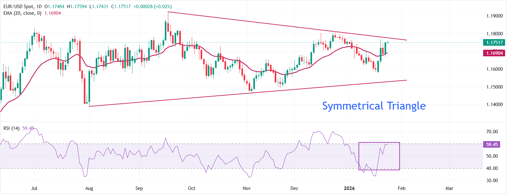 Exponential Moving Average (EMA) 20-hari di 1,1690 bergerak lebih tinggi, dan harga bertahan di atasnya, menjaga pemulihan jangka pendek tetap ada. Penutupan di atas EMA 20-hari akan mempertahankan bias bullish. Relative Strength Index (RSI) 14-hari di 59,44 menunjukkan momentum yang kuat.