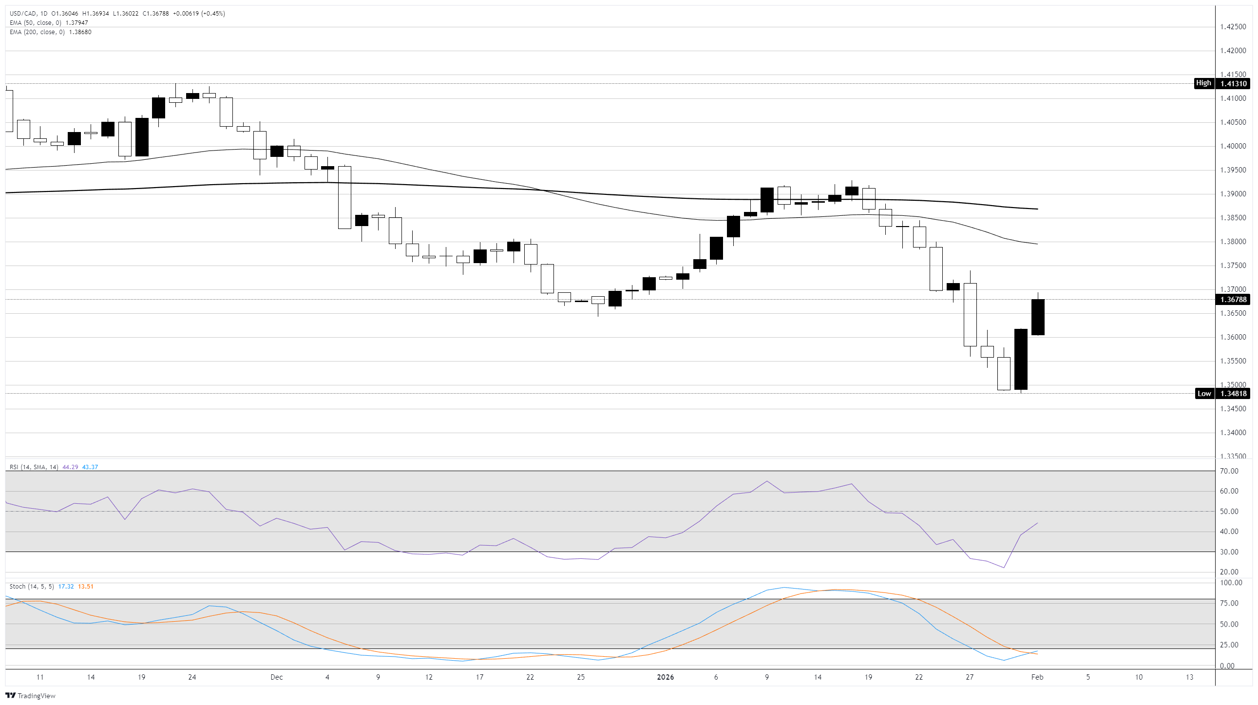 Resistance jangka pendek terlihat di 1,3670, didukung oleh pembukaan tahunan 2026 di 1,3725. Para pembeli perlu menutup pada basis mingguan di atas wilayah ini untuk mengindikasikan bahwa level terendah yang lebih signifikan telah terbentuk. Dengan data resmi AS kini ditangguhkan akibat penutupan pemerintah, volatilitas mungkin tetap rendah hingga pasar menerima katalis baru. Bias yang lebih luas tetap bearish sementara harga bertahan di bawah EMA 50-hari, meskipun ketidakhadiran rilis data ekonomi penting dapat menjaga USD/CAD tetap dalam kisaran di jangka pendek.