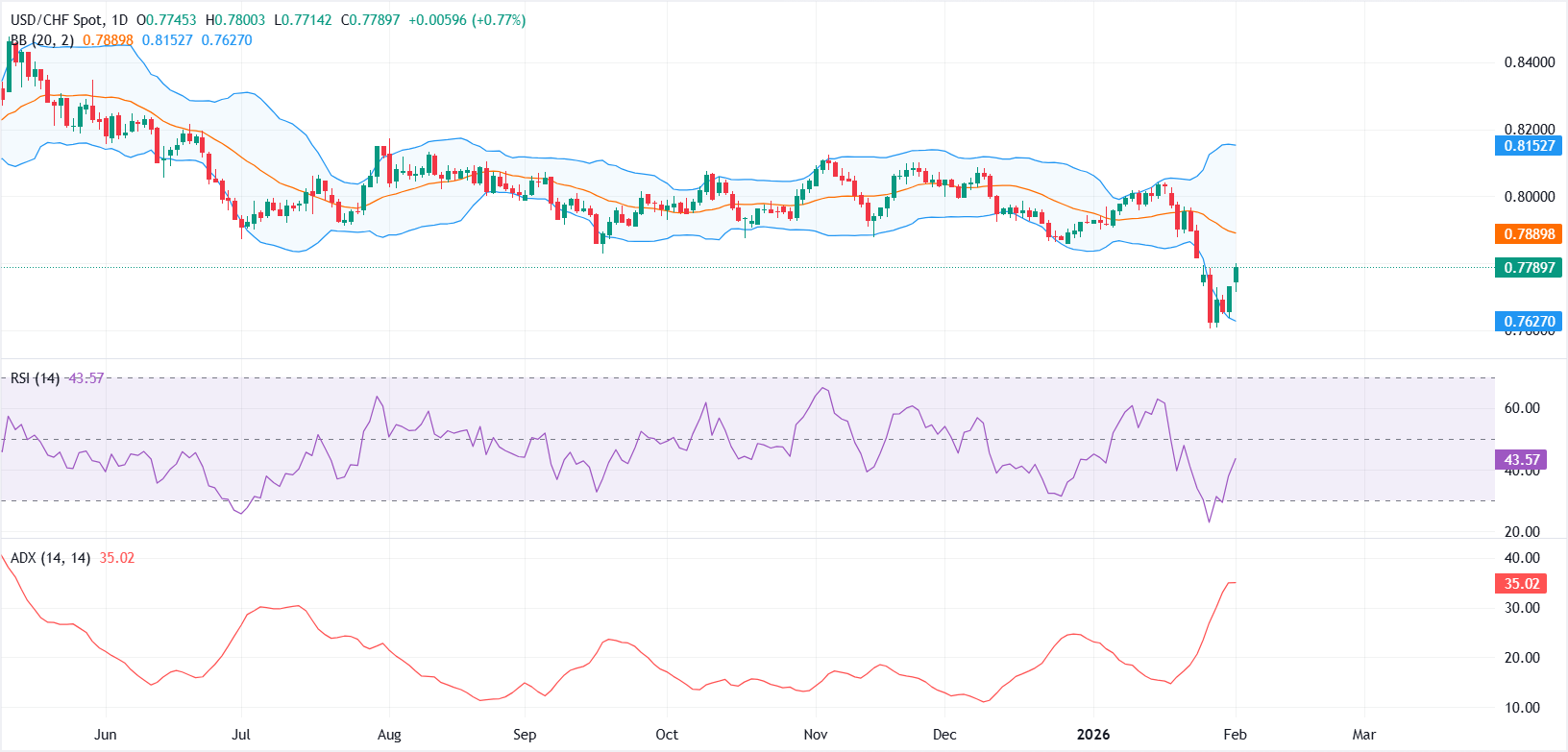 Dari perspektif teknis, USD/CHF tetap rentan terhadap penurunan lebih lanjut setelah menembus zona support multi-bulan di dekat 0,7850 minggu lalu. Aksi jual ini disertai dengan ekspansi yang jelas pada Bollinger Bands, menunjukkan meningkatnya volatilitas.