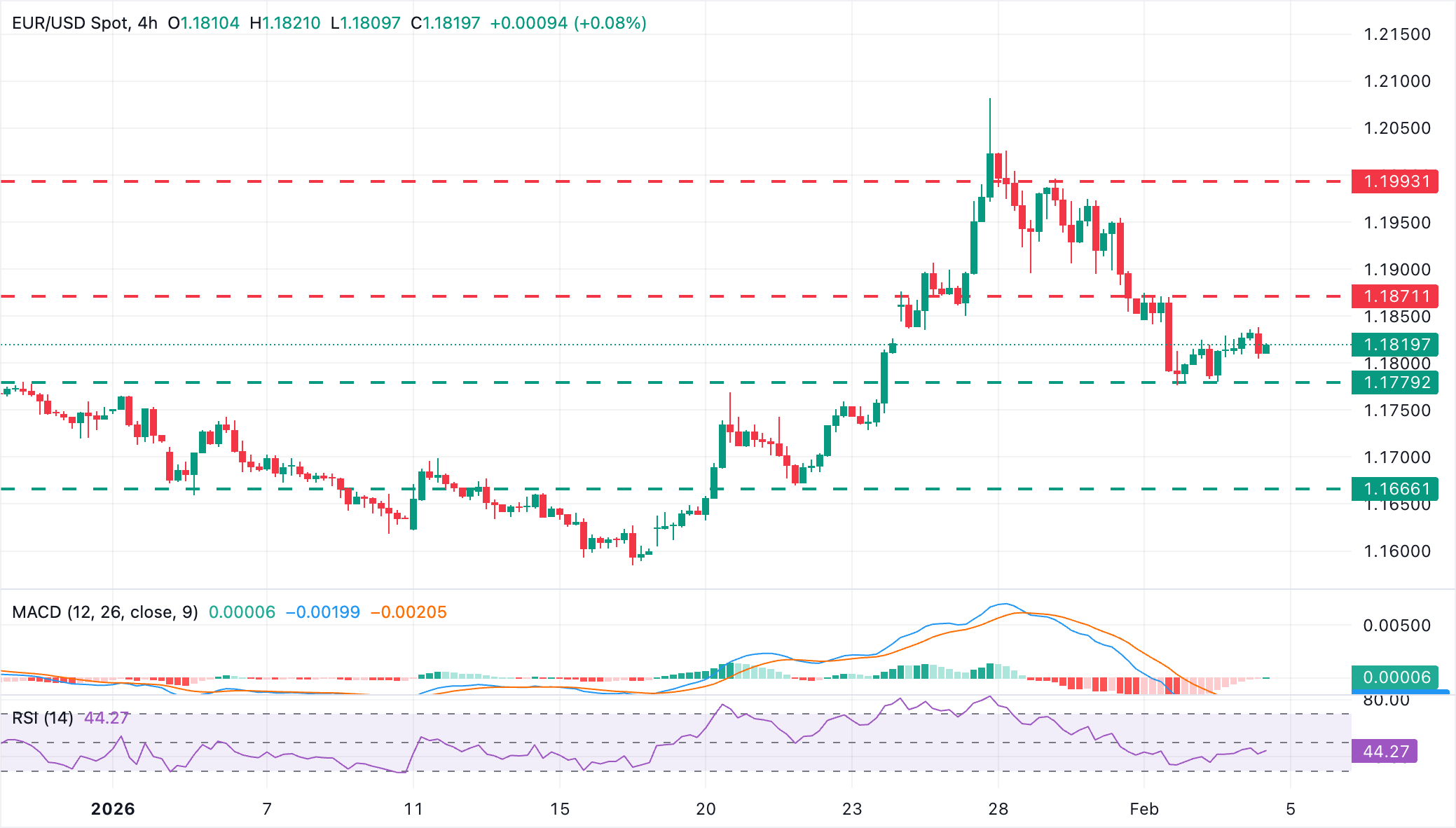 EUR/USD menunjukkan pemulihan moderat dari terendah Senin di 1,1775, dengan indikator-indikator pada grafik 4 jam menyoroti tekanan bearish memudar. Garis Moving Average Convergence Divergence (MACD) tampaknya akan melintasi di atas garis sinyal, yang akan menjadi pergerakan bullish, dan Relative Strength Index (RSI) telah mencapai level-level tepat di bawah garis 50, yang membagi area bearish dan bullish.