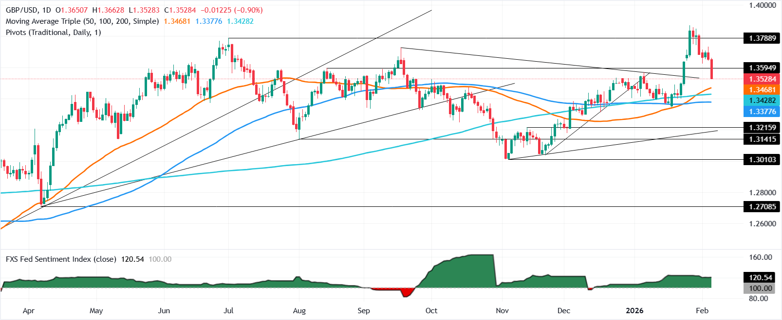 - GBP/USD merosot setelah keputusan 'dovish' 5–4 oleh Bank of England yang mempertahankan suku bunga tidak berubah di 3,75%.