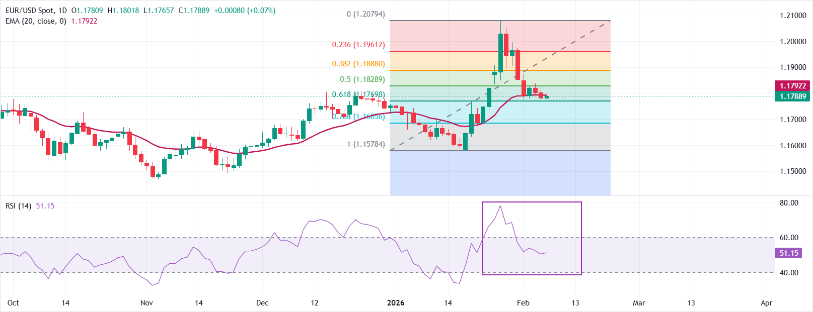 EUR/USD diperdagangkan lebih tinggi di sekitar 1,1789 pada saat berita ini ditulis. Exponential Moving Average (EMA) 20-hari naik di 1,1792, dengan harga spot bertahan sedikit di bawah dan membatasi upaya pemulihan sebelumnya. Penutupan yang tegas di atas EMA 20-hari akan memperkuat permintaan jangka pendek.