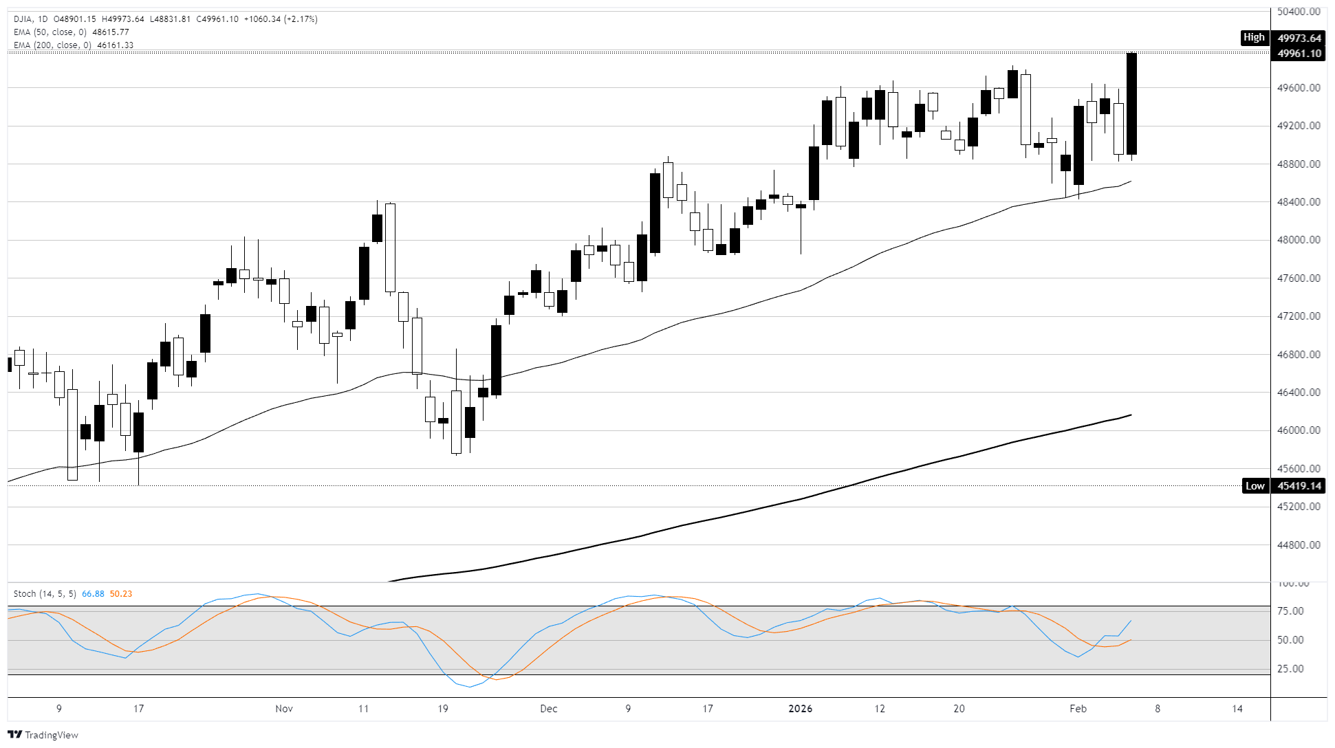 - Dow naik 1.050 poin, atau 2,15%, ditutup di 49.958,72, level tertinggi baru.