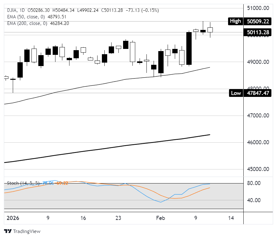 Dow Jones Industrial Average (DJIA) mengembalikan kenaikan awal pada hari Rabu, kehilangan sekitar 120 poin untuk ditutup turun sekitar 0,2% mendekati 50.010 setelah sempat merebut kembali level 50.000 di awal perdagangan. S&P 500 turun 0,2% sementara Nasdaq Composite jatuh 0,5%, tertekan oleh gelombang penjualan lain di nama-nama perangkat lunak perusahaan. Pasar awalnya menguat setelah laporan Nonfarm Payrolls (NFP) bulan Januari yang jauh lebih kuat dari yang diharapkan, tetapi antusiasme memudar saat investor mencerna komentar hawkish dari Federal Reserve (Fed) dan kekhawatiran baru bahwa alat kecerdasan buatan sedang menggerogoti model bisnis perangkat lunak tradisional.