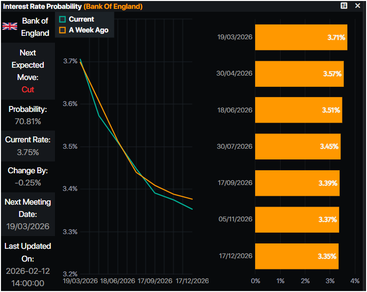 Pasar uang telah memperkirakan kemungkinan 70% pemotongan suku bunga oleh BoE pada pertemuan 19 Maret, menurut data Prime Market Terminal.