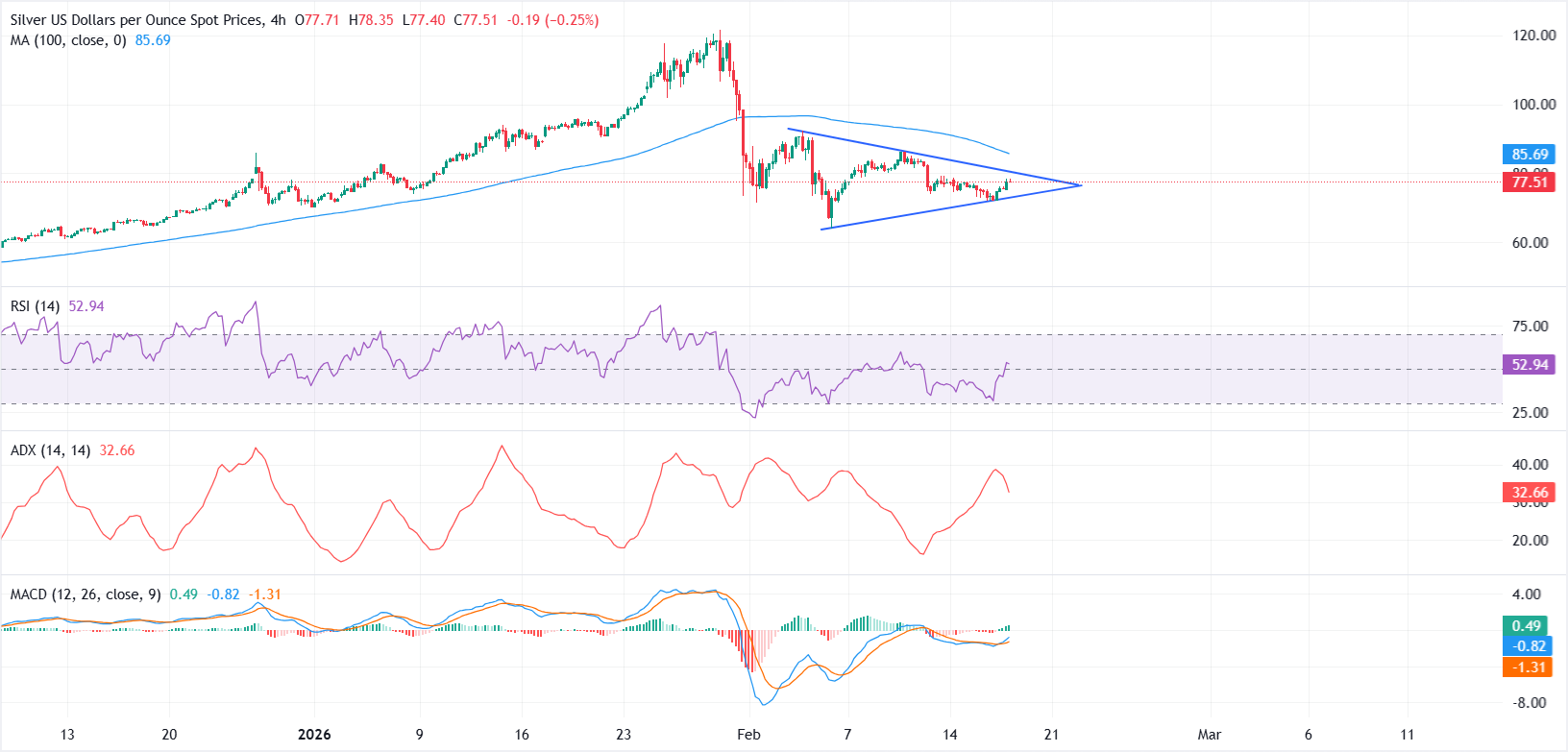 Dari sudut pandang teknis, grafik 4 jam mulai menunjukkan tanda-tanda konstruktif. XAG/USD membentuk pola segitiga, dengan aksi harga yang terkompresi dan volatilitas yang menyempit, meningkatkan risiko penembusan ke arah mana pun.