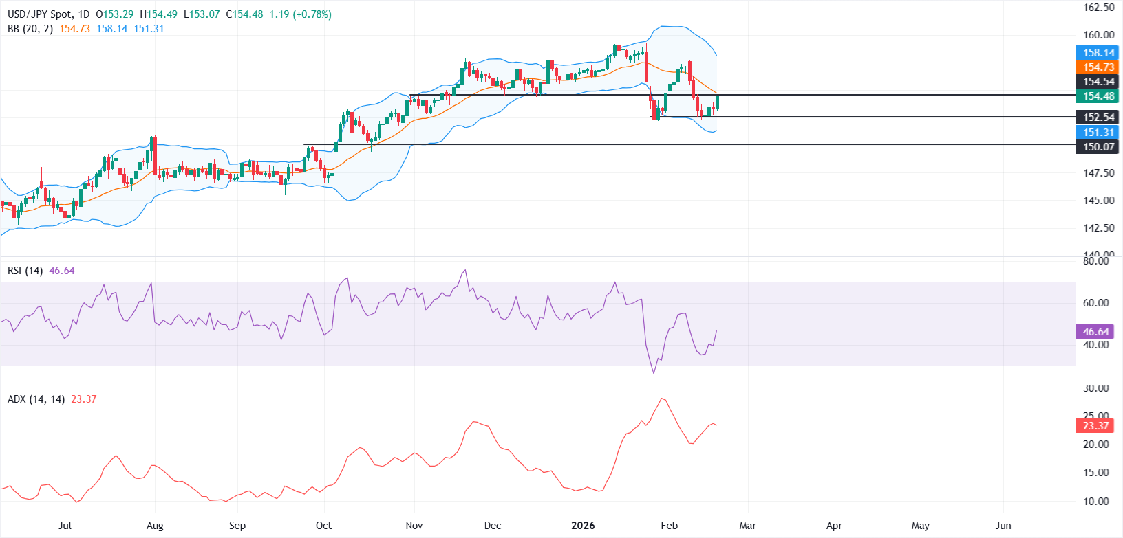 Resistance awal terlihat di wilayah 154,70-155,00. Pergerakan berkelanjutan di atas zona ini dapat meningkatkan momentum dan membuka jalan menuju ujung atas Bollinger Band di dekat 158,14.