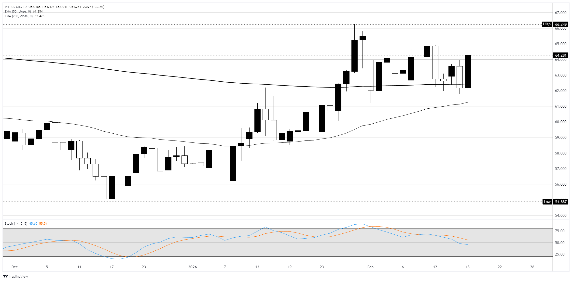 Pada grafik harian, WTI membuka sesi hari Selasa di dekat $62,20, naik 3,4% pada hari itu. Rally mendorong harga kembali di atas EMA 200-hari dan 50-hari, mengembalikan keselarasan bullish setelah beberapa sesi menguji level 200-hari dari kedua sisi. Pergerakan ini menghapus kerugian sesi sebelumnya dan mendorong aksi harga kembali ke setengah atas kisaran konsolidasi yang telah bertahan sejak pullback akhir Januari dari tertinggi awal tahun. Stochastic Oscillator terjebak di zona tengah, menunjukkan momentum memiliki ruang untuk berkembang ke arah mana pun. Resistance berada di $65,00 dan tertinggi tahun berjalan di $66,25; penembusan di atasnya akan membuka jalan menuju level $67,00. Support berada di EMA 200-hari di dekat $62,45, dengan kegagalan di sana mengekspos EMA 50-hari di $61,25.