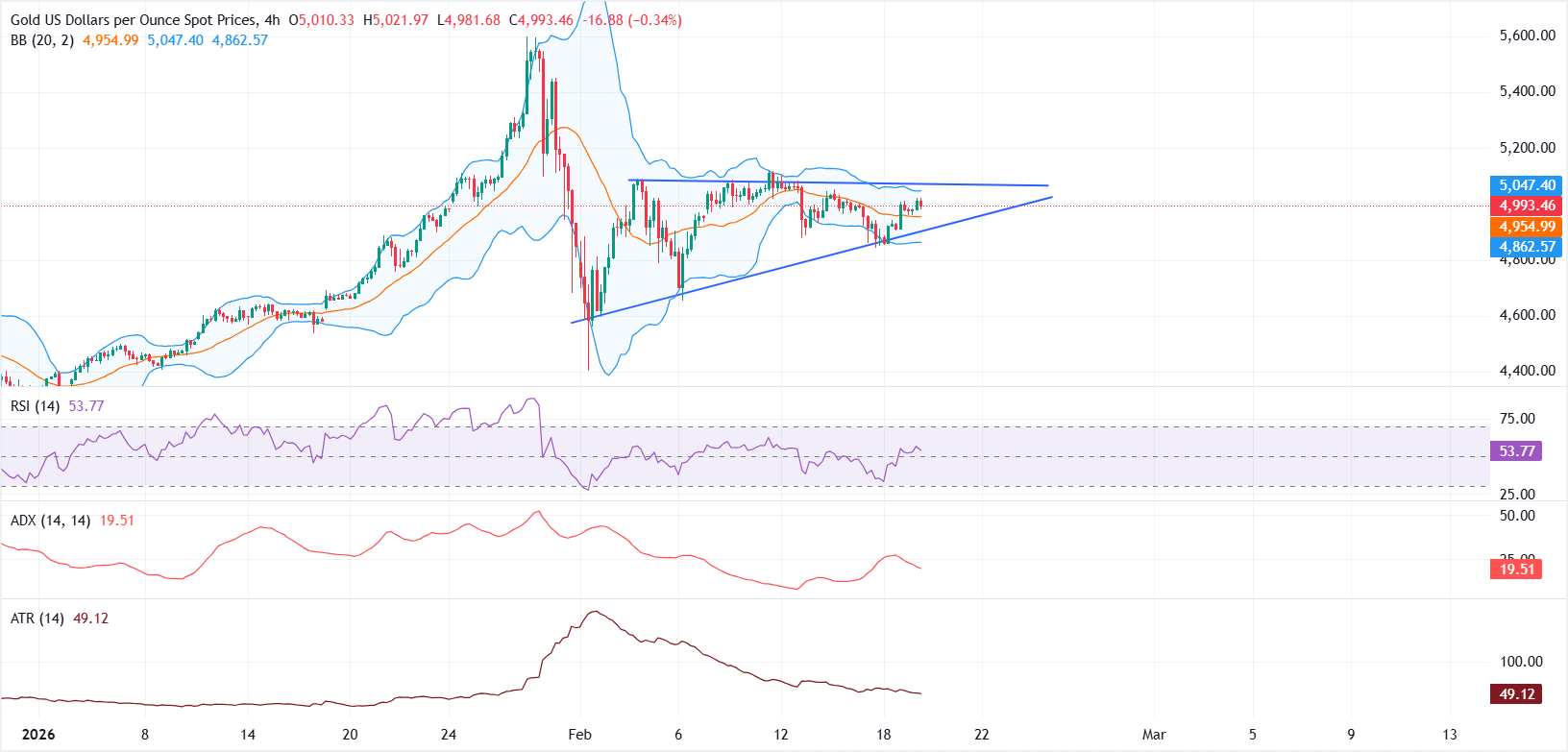 Dari perspektif teknis, grafik 4 jam menunjukkan harga bertahan di atas Simple Moving Average (SMA) 20 periode, yang juga membentuk Bollinger Band tengah di dekat $4.954, menjaga bias jangka pendek sedikit mendukung.