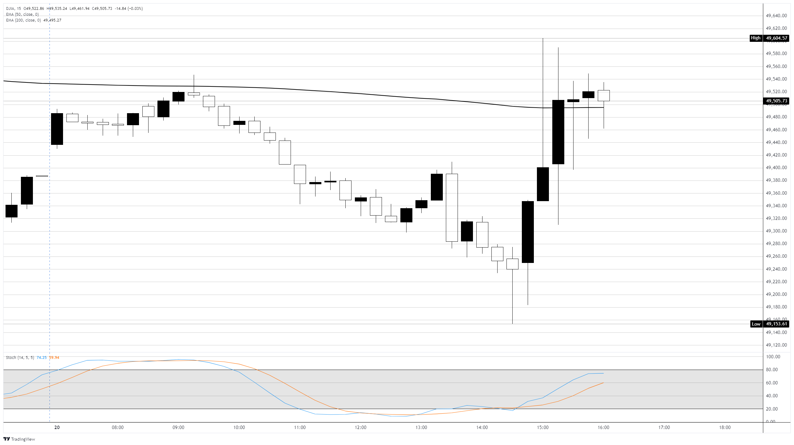 Dow Jones Industrial Average (DJIA) membalikkan kerugian sesi awal pada hari Jumat setelah Mahkamah Agung AS membatalkan tarif luas Presiden Trump dalam keputusan bersejarah 6-3. Dow naik 207 poin, atau 0,42%, untuk diperdagangkan mendekati 49.600 setelah jatuh lebih dari 200 poin di awal perdagangan akibat data ekonomi yang mengecewakan. S&P 500 naik 0,52% menjadi 6.895 dan Nasdaq Composite naik 0,68% menjadi 22.837. ETF yang banyak berfokus pada ritel seperti SPDR S&P Retail ETF (XRT) sempat melonjak 1,8% segera setelah keputusan tersebut, dengan perusahaan yang paling terpengaruh oleh bea masuk memimpin kenaikan.