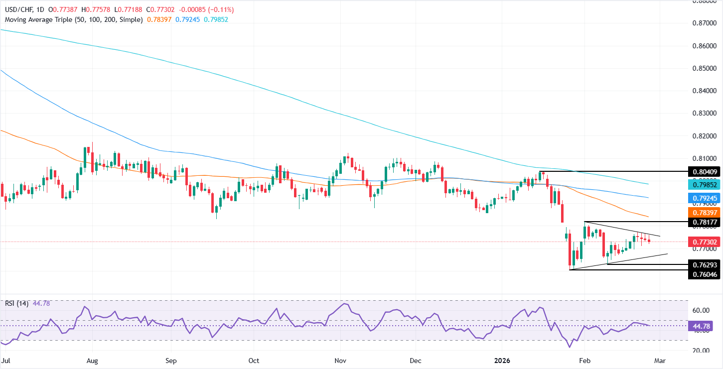 USD/CHF melanjutkan pelemahannya untuk empat hari perdagangan berturut-turut, turun 0,14%, namun tetap terkurung dalam kisaran 0,7718-0,7757 selama tiga hari terakhir. Pada saat berita ini ditulis, diperdagangkan di 0,7729, di atas Simple Moving Average (SMA) 20-hari di 0,7726.