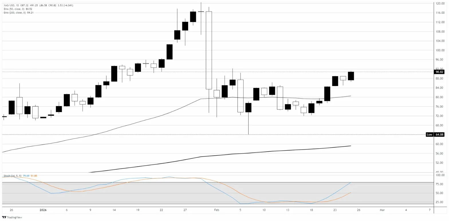 XAG/USD melonjak sekitar 4% pada hari Rabu, rally tajam untuk ditutup dekat $91 dalam sesi yang didorong oleh permintaan safe-haven yang diperbarui. Pasangan ini telah pulih dari jatuhnya akhir Januari, ketika harga anjlok dari tertinggi sepanjang masa di atas $121 ke titik terendah sekitar $64 pada awal Februari, penurunan sekitar 47%. Sejak mencapai titik terendah, Perak telah membangun pola dasar dengan serangkaian higher lows antara sekitar $76 dan $90 selama tiga minggu terakhir, dan candle bullish kuat pada hari Selasa mendorong harga kembali di atas angka bulat $90 untuk pertama kalinya sejak aksi jual.