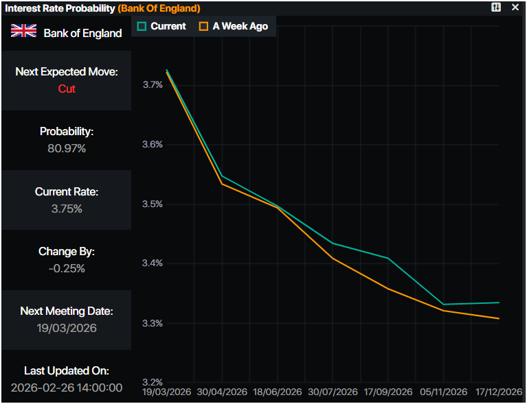 Pasar uang telah memperhitungkan peluang 81% pemangkasan suku bunga BoE dalam pertemuan 19 Maret, menurut data Prime Market Terminal.