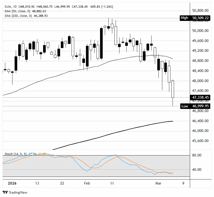 Indeks Dow Jones Industrial Average turun sekitar 600 poin, atau 1,26%, mendekati 47.340 pada hari Jumat pada saat berita ini ditulis, mengakhiri minggu yang brutal yang melihat indeks blue-chip kehilangan lebih dari 1.000 poin. S&P 500 diperdagangkan di dekat 6.750, turun sekitar 1,1%, sementara Nasdaq Composite berada di sekitar 22.550, turun sekitar 0,9%. Kerusakan sesi ini didorong oleh kombinasi laporan pekerjaan yang sangat buruk dan lonjakan harga minyak yang terkait dengan konflik AS-Iran, dengan minyak mentah WTI menembus di atas $89 dan Brent mencapai lebih dari $91.