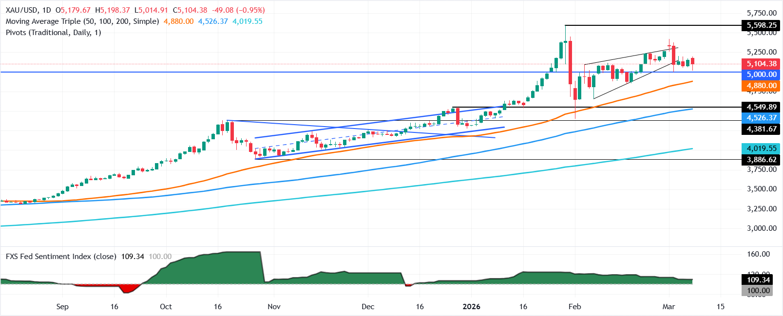 Jika XAU/USD jatuh di bawah $5.050, support pertama akan berada di level $5.000. Penembusan level ini akan mengekspos SMA 50-hari di dekat $4.868 sebelum terendah siklus 17 Februari di $4.841.