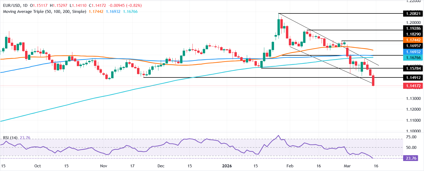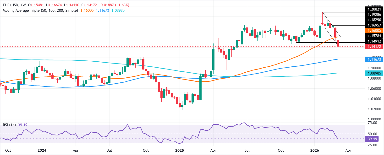 - EUR/USD turun 1,74% dalam seminggu, diperdagangkan di dekat 1,1414 setelah merosot di bawah SMA 200-hari.