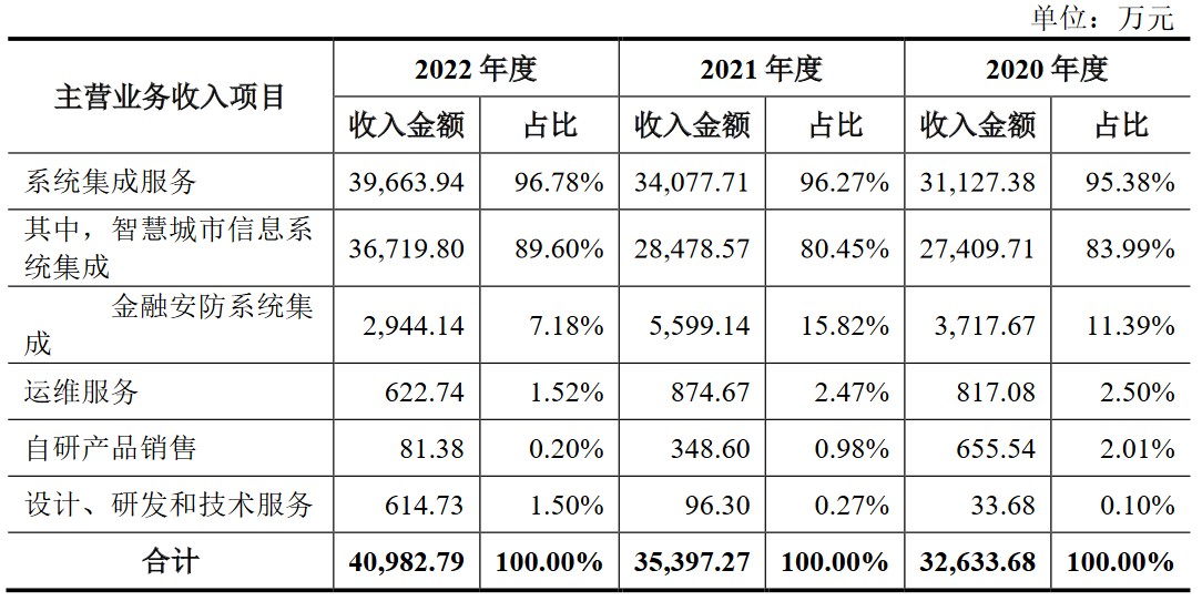 招股书披露,君逸数码是一家专业的智慧城市综合解决方案提供商,主营业务是为智慧城市领域客户提供系统集成服务、运维服务和自研产品销售等产品和服务。公司以智能视频分析技术、音视频接入和处理技术、地理空间信息处理技术、物联网边缘服务网关技术、能源管理节能技术、大数据平台技术等核心技术作为技术支撑,根据客户的个性化和定制化需求,为政府机关、国有企业、事业单位等用户提供智慧市政、智慧管廊、智慧公安、智慧交通及智慧楼宇、智慧场馆、智慧金融安防、智慧校园等领域的智慧城市综合解决方案。